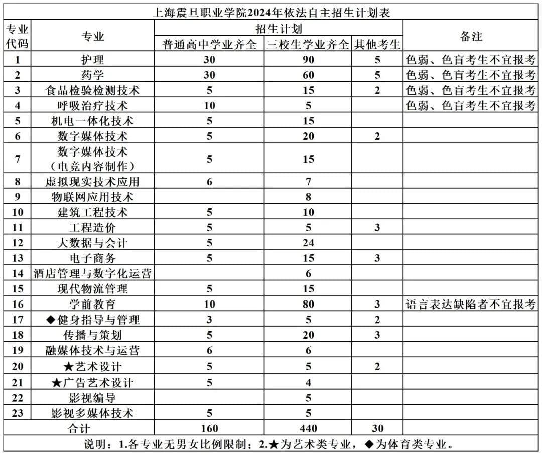 2024年我校自主招生专业23个,招生计划数630人:其中,普通高中学业齐全160人,三校生学业齐全440人,其他考生30人。